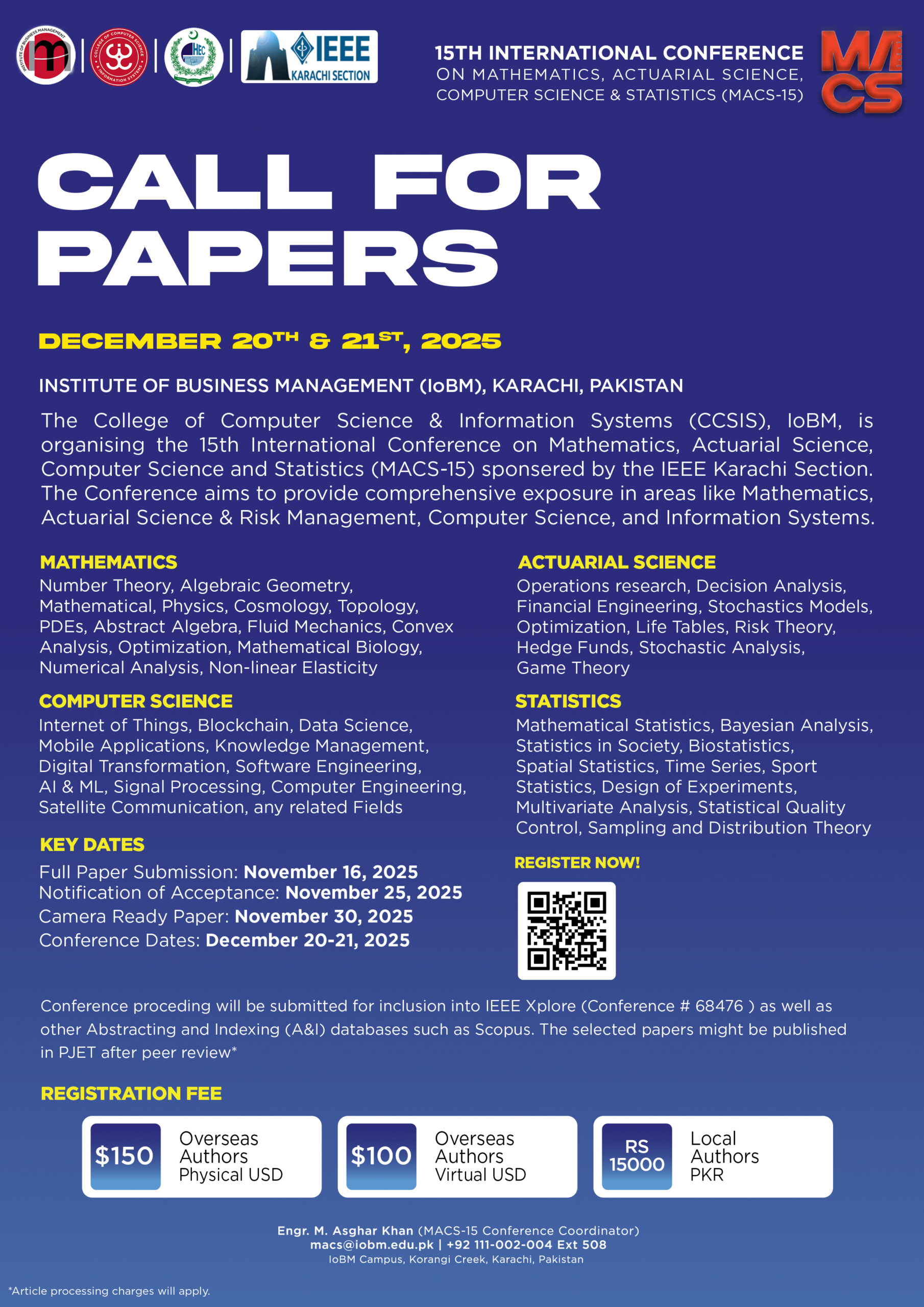 CCSIS is organizing the 15th International Conference on Mathematics, Actuarial Science, Computer Science, and Statistics (MACS-15) with technical sponsorship of the IEEE Karachi Section. The Conference is aimed to give the highest quality exposure to Mathematics, Actuarial Science & Risk Management, Computer Science, Engineering and Information Systems, and Technology. This event will attract practicing professionals, researchers, academicians, and students from Pakistan and abroad.